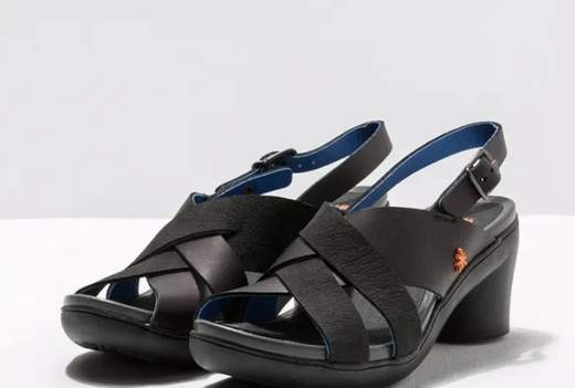 Comodo sandalo aperto con tacco 7 quadrato in gomma. Ampie fasce in pelle che si incrociano sul collo piede e cinturino sul talloneCodice