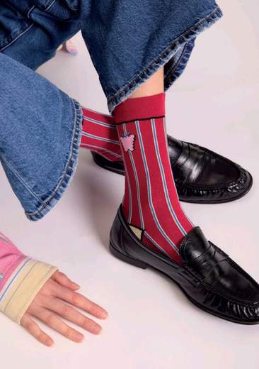 Calzini a righe verticali mattone da donna. Fondo mattone, righe celesti e gialle, disegno di un frutto sul fianco. Punta e tallone gialli e profilo nero lungo il retro della gamba. taglia unica Leggi tutto