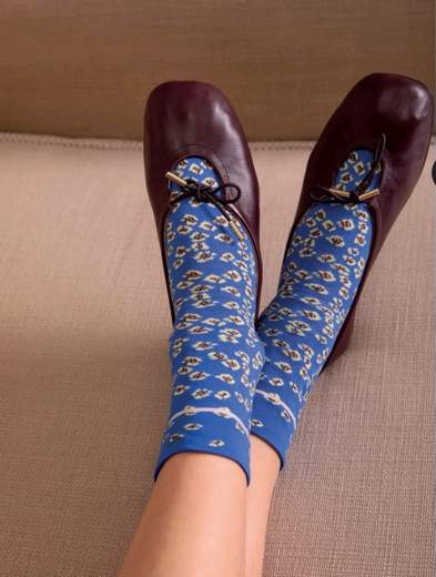 Calzini maculati blu da donna. Con piccoli fiori bi nchi, fondo bluette, punta e tallone bianco perla e profilo menta lungo il retro della gamba.