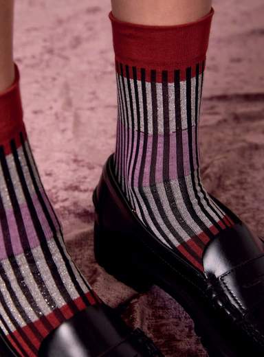 Calzini "Organetto" a righe color mattone da donna. Con righe orizzontali mattone, grigio lurex e rosa, righe verticali nere in rilievo, punta e tallone neri e profilo mattone lungo il retro della gamba.taglia unica