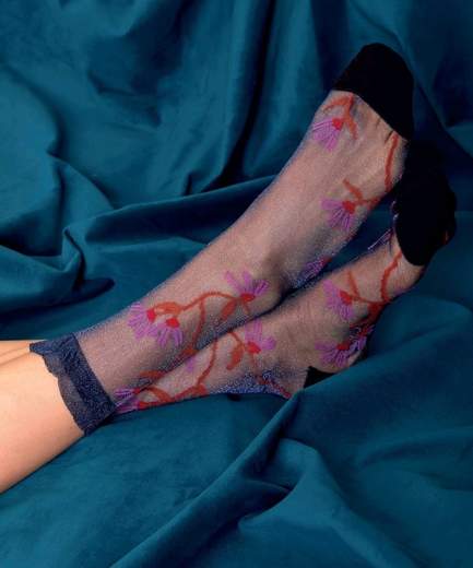 Calzini velati blu notte da donna. Trasparenti, con fantasia floreale colorata ricamata. Punta e tallone neri e profilo nero lungo il retro della gamba.taglia unica