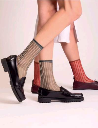 Calzini da donna trasparenti a righe panna su fondo color acqua, punta e tallone neri e profilo lilla lungo il retro della gamba.taglia unica