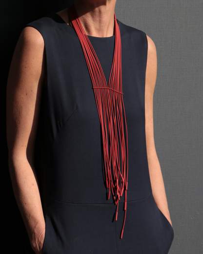 Fili di caucciù opaco o metallizzato in fluido movimento fermati da piccoli cilindri: collana che valorizza anche il più semplice vestitoCollana composta da morbido caucciù in colore opaco o metallizzato