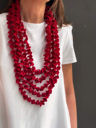La collana Laccio è un'espressione pura del design contemporaneo. Un'armonia di linee morbide e tessuto elastico che avvolge il collo con grazia, esaltando qualsiasi décolleté. La chiusura magnetica in resina ne facilita l'indosso, rendendola perfetta per ogni occasione. Un gioiello di design che unisce estetica e comfort, ideale da indossare sia con outfit casual che più formali.Laccio collana lunga in tessuto elastico con chiusura magnetica in resina