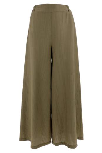 Pantaloni in morbido tessuto di misto viscosa dall’effetto stropicciato e dalla linea ampia e morbida. Fascione dritto davanti ed elastico sul retro. Tasche laterali oblique. Composizione: 84% viscosa, 16% nylon. Provenienza: Italia. Lavaggio a 30°.Codice