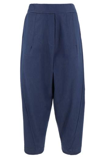 Pantaloni a ovetto dalla vestibilità morbida in bengalina di viscosa elasticizzata con patta e pinces sul davanti e tasche a filetto sul retro. Fascione liscio davanti ed elastico sul retro. Composizione: 70% viscosa, 26% nylon, 4% elastan. Provenienza: Italia. Lavaggio a 30°.Codice