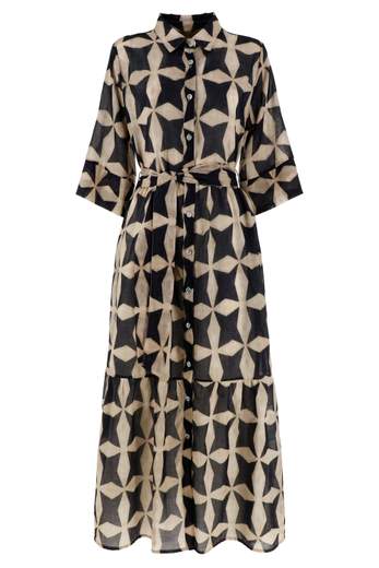 Vestito di media lunghezza, in morbida viscosa, con scollo tondo e maniche a 3/4 scampanate. Modello dritto. Composizione: 100% viscosa.